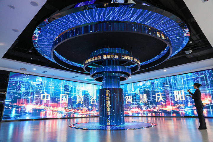 在全国一体化算力网络国家枢纽节点(甘肃)庆阳数据中心集群展示中心,工作人员介绍“东数西算”工程规划及建设推进情况(2025年1月6日摄)。新华社记者 郎兵兵 摄